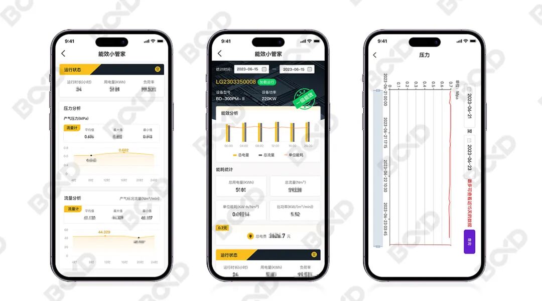 部分制造业的传统空压站由于依靠人工管理,设备管理员无法长时间监测设备运行数据,设备无法提前预警甚至带伤运行,等问题出现了再去排查处理,造成非预期停产,给企业带来经济损失。 人工管理空压机,主要有以下两个弊端: ⇒及时性比较差,遇到问题才去分析排查; ⇒人工调控管理,信息监管程度低,人工调节气压气量,与末端需求的精确度不同步。 因此,利用数字化对空压机进进行持续监测、自动化分析潜在风险,快速通知设备管理员规避风险,是一种全新的数字化智能化管理方式。 葆德贴心了解用户需求,全新升级的葆德二级压缩系列,在空压机原硬件系统的基础上,新增硬件数据监测模块,结合物联网、云计算、大数据等前沿科技,依托多维的信息采集及精准的传感器检测技术,新增“智能管家”模块集成到原“葆德云”系统,让空压机智能化功能再升级。 新增的“智能管家”模块,集特征采集、监测监控、智能预警、智能诊断、模型训练及数据可视化于一体。主要包括三个子版块,分别是:智慧能效、智慧维保、智慧健康。 1.智慧能效,节能降耗“更精准” 通过数据采集与分析,为空压机管理员给到优化建议,从而达到降低能耗且节能的目的。 能耗采集:通过空压机内置的数字化能耗采集模块,能耗实时数据采集。 能效优化:智慧能效能实时监测空压机的输入功率、电流、电压,累计电量、空压机的产气量等能耗参数。为用户在峰、平、谷各时段提供单位能耗优化建议,为用户实现节能降耗。 2.智慧维保,提前预警“少跑腿” 空滤是空压机的第一道防线,过滤空气的粉尘、颗粒物;油滤用来过滤润滑油中的杂质,使空压机润滑系统保持洁净。 监测监控:通过内置的数据采集模块,监测空滤与油滤的前后运行压差。 智能预警:监测空气和机组润滑油的质量状态,空滤与油滤的压差为设定提示值时,空压机进行预警,提示更换配件、及时进行维护。 3.智慧健康,系统管理“无人守” 对设备数据采集,分析处理,对设备的运行性能实时监测、异常实时预警,协助工作人员及时发现设备故障,为智能预警提供数据支撑。 主机智能监测:实时监测主机的喷油压力和温度,监测主机健康状况,智能分析和科学判断主机的运行状况,推测主机轴承的使用情况。 电机智能诊断:实时监测电机的振动值并与标准值进行对比。监测定子线圈与轴承的温度,科学的预判电机的运行状况,当温度达到设定值时停机,系统自动预警。 油路健康监测:当温度与压力达到设定值时停机,系统自动报警,提醒更换或维保,保护设备安全。 4.葆德空压机,智能“再升级” 葆德空压机,配置了葆德云数字化管理系统,用户端可实现预提醒、预感知、预警告功能,实现设备的线上管理、线上服务、线上报修等多项智能化功能,提升了用户的使用体验。 葆德云数字化管理系统,为用户提供一键“报修服务”、用户可在线申请工单、在线评价、对维保及设备的运行历史全记录,便于用户对设备进行全生命周期管理。 葆德二级压缩系列“智能管家”模块的新增,让葆德空压机数字化智能化功能再升级,空压机监数据测更全面,管理更智能。 5.技术成熟,丰富的应用案例 央企/上市名企及大量细分行业的成功案例,均实现节能、稳定、可靠的应用效果,选择用数据说话的葆德节能空压机,为您的企业节能降耗,提升市场竞争力。▲葆德云能耗管理程序